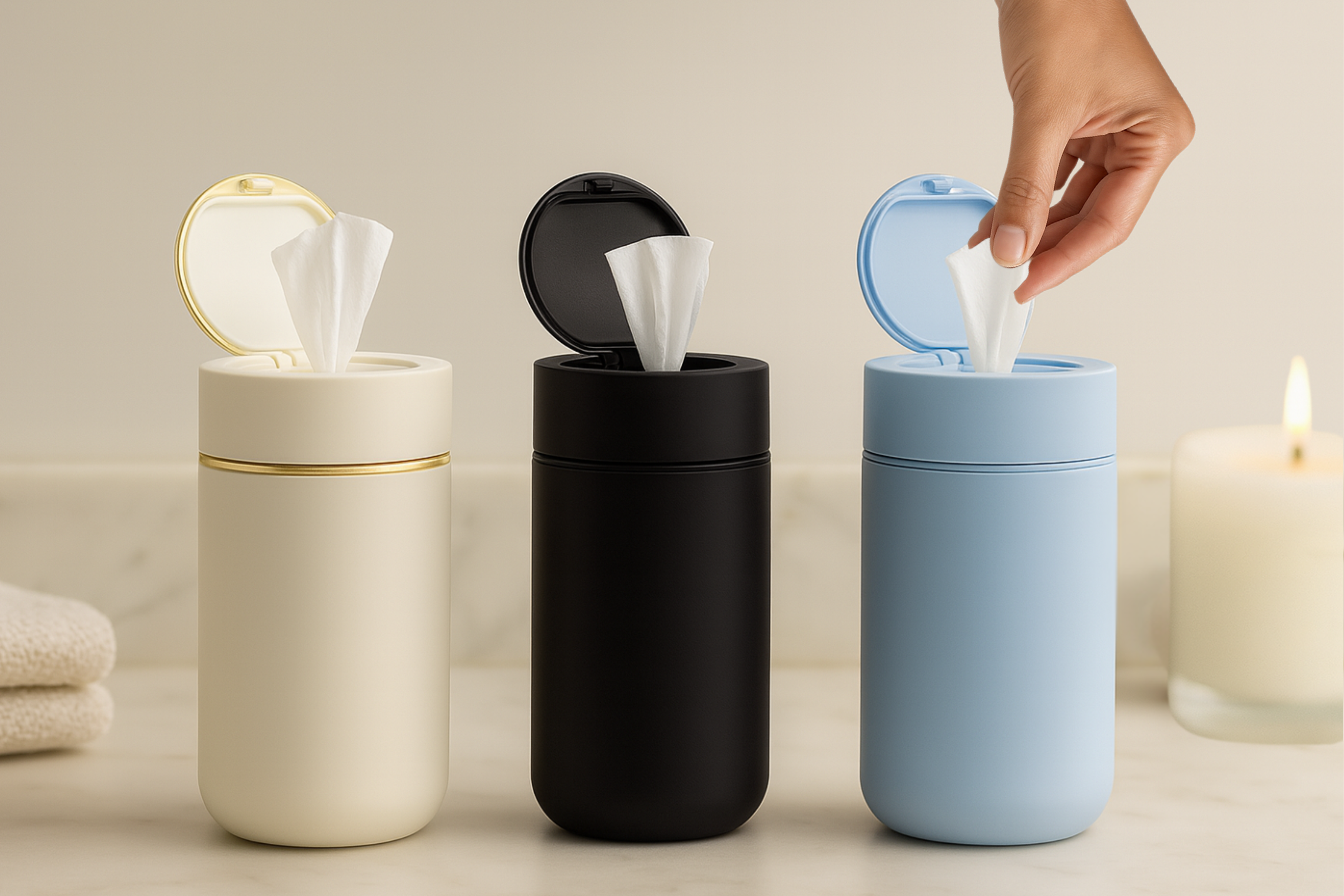 Push-button lid for moisture locking, and a refillable canister so you never run out of wipes.
